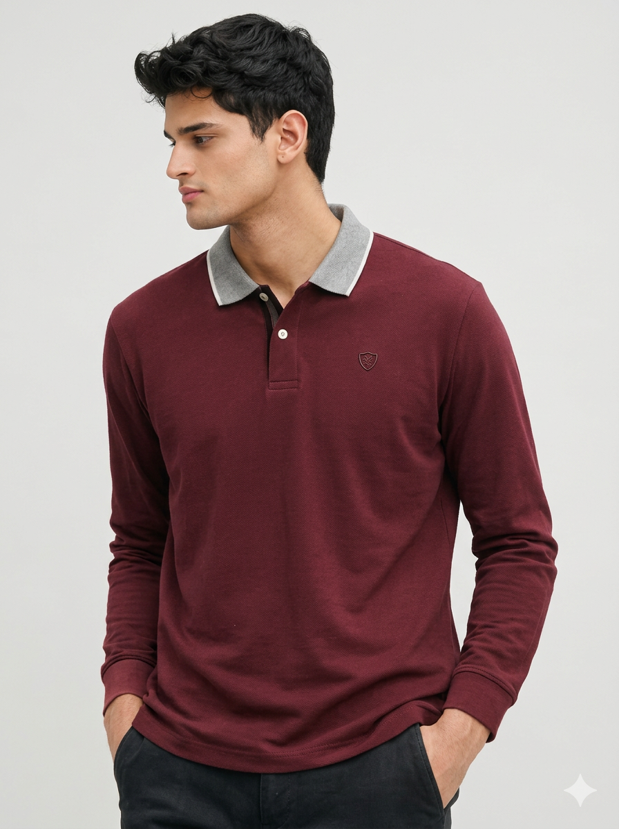 Be the first to review “Maroon Long-Sleeve Polo Shirt with Contrast Grey Collar”
